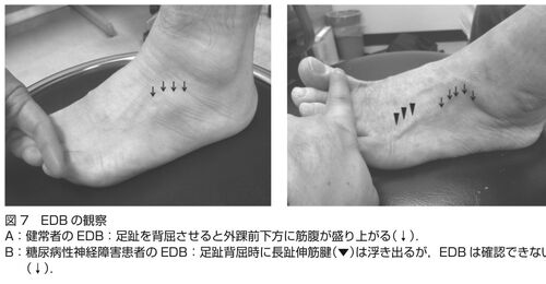 糖尿病性神経障害. 日内会誌. 2009; 98: 779-86. 短趾伸筋(EBD)は、外踝前方の足甲部に位置する小さな筋である。 このEDBは、下肢最遠位筋であり、糖尿病性末梢神経障害に伴う筋萎縮が初期から起こる。しかし、筋の機能としては趾伸展の一部を担うのみである…