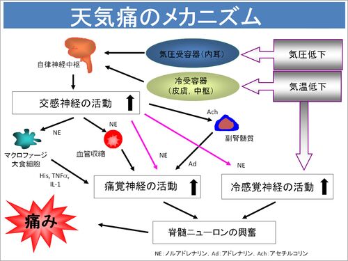 佐藤純.気象変化による慢性痛悪化のメカニズム.日生気誌.2003;40(4):219-224. 佐藤純.天候変化と慢性疼痛.ペインクリニック.2006;27:603-609. 関節リウマチなどの多くの慢性疼痛疾患において、天候変化と疼痛の程度に関係があるとする報告がある。 その…