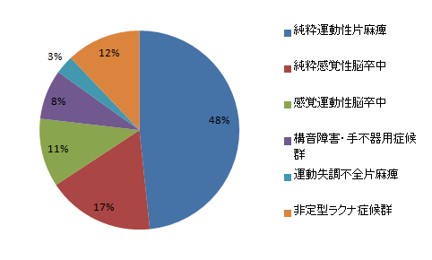 突然発症はラクナ症候群に有意に多く、基礎疾患に心房細動や糖尿病などに違いがあった。